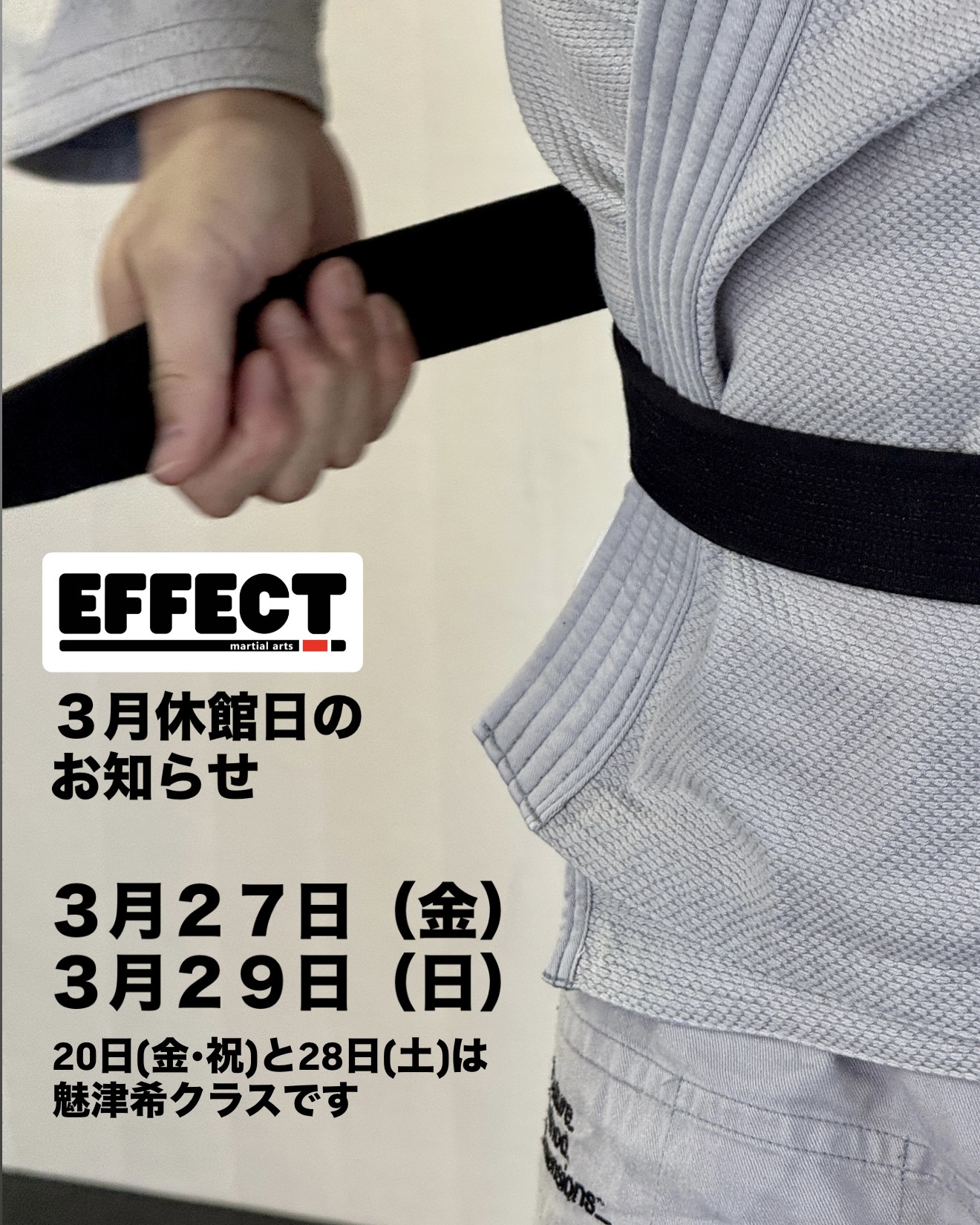 2026年3月休館日のお知らせ 2026年3月2日 最終更新日時 : 2026年3月17日 Admin 日差しが暖かくなり、少しずつ春の訪れを感じる季節になりましたね。 冬の間に固まった身体を、EFFECTで心地よく動かしてリフレッシュしませんか?🔥 運動不足の解消はもちろん、新生活に向けた体力づくりや気分転換も大歓迎です! 3月も元気に、楽しくトレーニングしていきましょう。 みなさまのご来館を心よりお待ちしています!