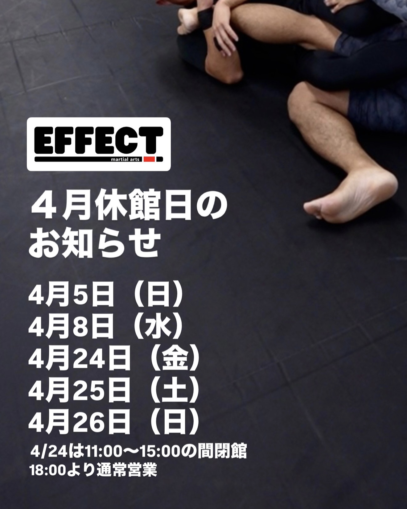 2026年 4月休館日のお知らせ 2026年4月2日 最終更新日時 : 2026年4月2日 Admin Screenshot 日差しもすっかり春らしくなり、外に出るのが楽しい季節がやってきましたね! 心機一転、EFFECTで心地よい汗を流して、身体をアップデートしていきましょう!🔥 「今年こそは!」という新しい目標づくりや、溜まった疲れの気分転換も全力でサポートします。 4月もパワフルに、楽しくトレーニングに励んでいきましょう! みなさまのご来館を心よりお待ちしています!